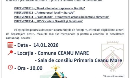 Dragi cetățeni ai Comunei Ceanu Mare, Vă aducem la cunoștință că miercuri, 14 ianuarie 2026, începând cu ora 10:00, în Sala de...