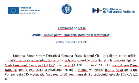 Comunicat de presă „PNRR: Fonduri pentru România modernă și reformată!”” -anunț finalizare proiect- Unitatea Administrativ-Teritorială Comuna Frata, județul Cluj, în calitate de...