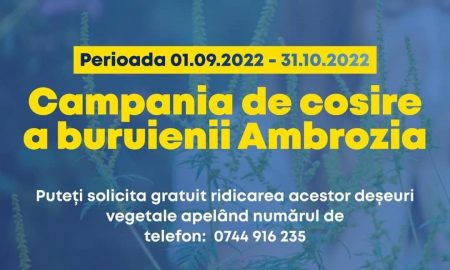 Acțiunile de cosire a buruienii Ambrozia continuă în perioada 01.09.2022 – 31.10.2022, intervalul orar 10:00 -15:00, pe domeniile publice aflate în administrare....
