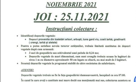 Joi, 25 noiembrie 2021 Instrucțiuni colectare : • Identificați deșeurile vegetale: • Deșeuri provenite din toaletări arbori, arbuști, tuns gard viu, cosit...