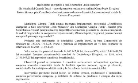 Municipiul Câmpia Turzii a anunțat demararea proiectului de reabilitare energetică a Sălii Sporturilor „Ioan Stanatiev”, o investiție majoră realizată cu sprijinul Contribuției...