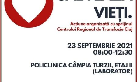Campania „Donează sânge. Salvează vieţi” va avea loc în data de 23 septembrie 2021, în incinta Policlinicii Câmpia Turzii, Etajul II (Laborator),...