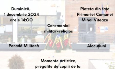 Când? Duminică, 1 Decembrie 2024, ora 14:00 Unde? Piațeta din fața Primăriei Comunei Mihai Viteazu. Primăria și Consiliul Local Mihai Viteazu, împreună...
